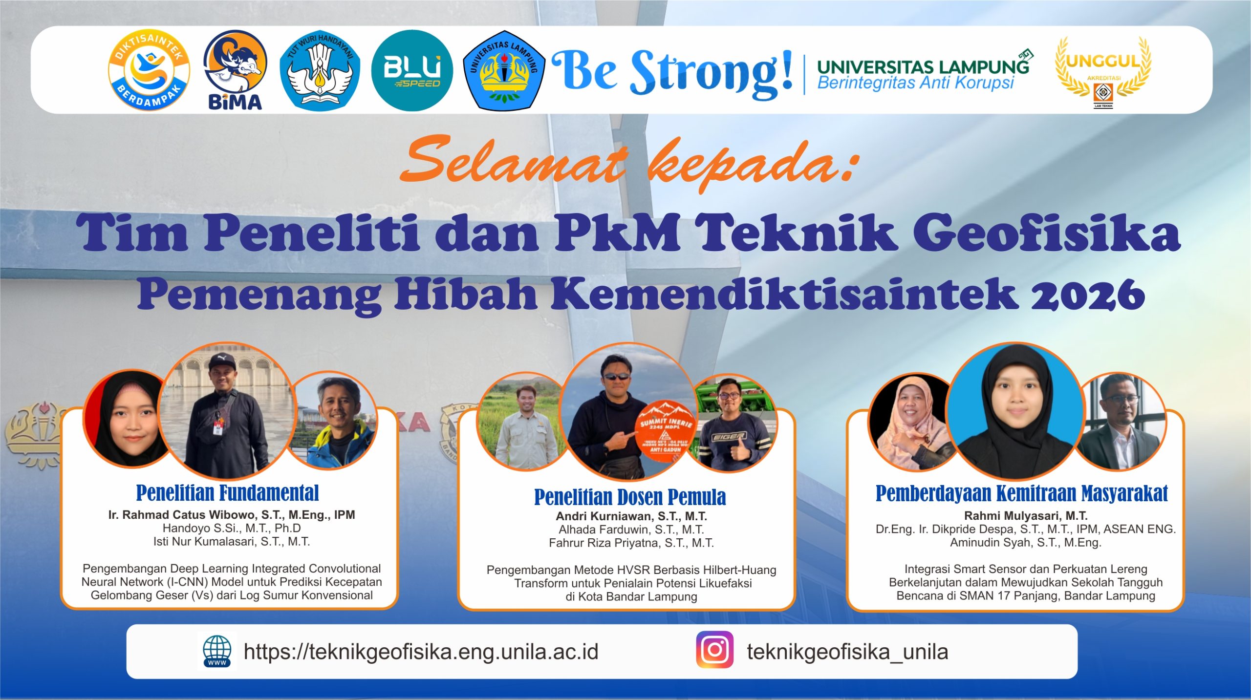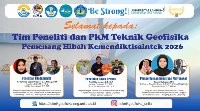 Jurusan Teknik Geofisika Universitas Lampung kembali berhasil meraih hibah Penelitian dan Pengabdian kepada Masyarakat (PKM) BIMA tahun 2026. Program hibah ini diselenggarakan oleh Kementerian Pendidikan Tinggi, Sains, dan Teknologi sebagai bentuk dukungan terhadap pengembangan riset dan kontribusi nyata perguruan tinggi bagi masyarakat. Tiga dosen Teknik Geofisika Universitas Lampung berhasil lolos pendanaan pada skema yang berbeda, mencerminkan keberagaman fokus riset dan pengabdian yang inovatif serta aplikatif.