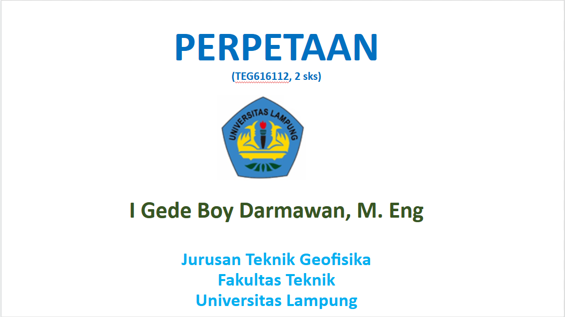 Kepada seluruh mahasiwa Prodi Teknik Geofisika yang menggambil MK Perpetaan Semester Genap t.a. 2019/2020 diwajibkan untuk mengikuti perkuliahan secara daring menggunaan vclass dengan tautan atau dengan mengunjungi LINK ini. Untuk dapat mengakses kelas Perpetaan di vclass, anda diwajibkan untuk login menggunakan akun SSO Unila kemudian melakukan proses enrollment dengan password yang akan dibagikan saat perkuliahan melalui ketua kelas/perwakilan kelas. Jadwal enrollment dan perkuliahan daring di vclass tetap sama dengan jadwal perkuliahan reguler seperti biasa. Oleh karena itu, mahasiswa harus siap mengikuti perkuliahan ini secara daring dari tempat masing-masing. Sampai Jumpa di vclass !